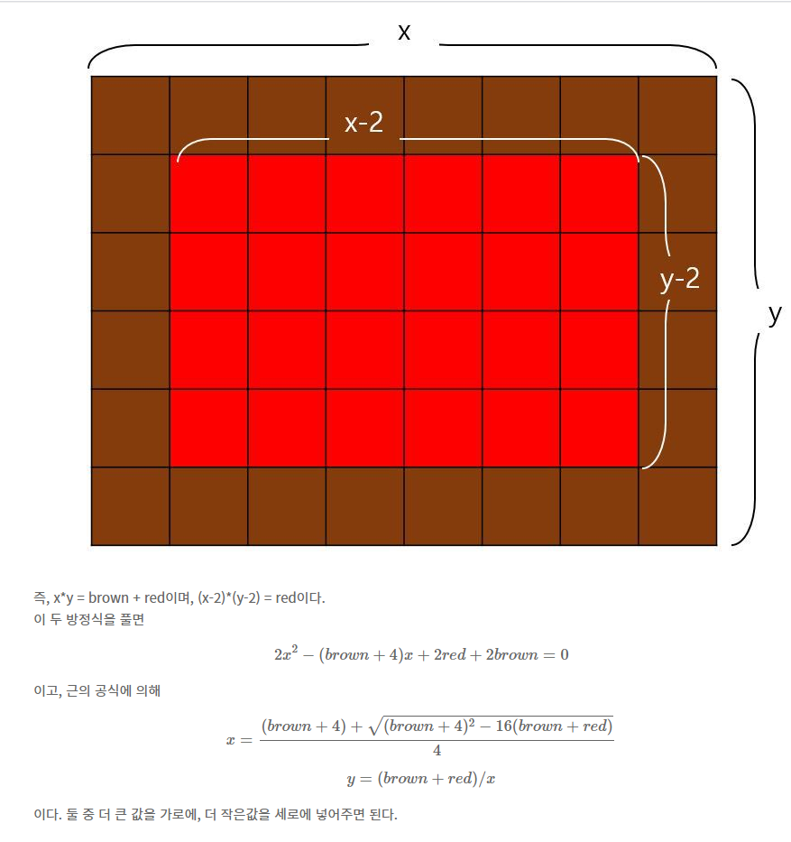Leo가 본 카펫에서 갈색 격자의 수 brown, 노란색 격자의 수 yellow가 매개변수로 주어질 때 카펫의 가로, 세로 크기를 순서대로 배열에 담아 return 하도록 solution 함수를 작성해주세요.