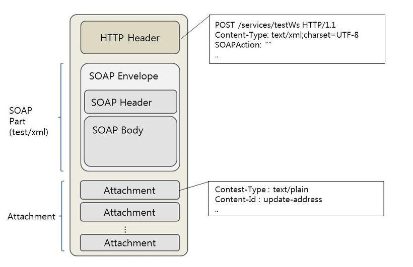 SOAP 메시지는 아래 그림과 같이 SOAP 봉투(envelope), SOAP 헤더(header), SOAP 바디(body)로 구성된 하나의 XML 문서로 표현되는 데 이러한 복잡한 구성으로 인해 HTTP 상에서 전 달되기 무겁고, 메시지 인코딩/디코딩 과정 등 웹 서비스 개발의 난이도가 높아 개발 환경의 지원이 필요하다.
