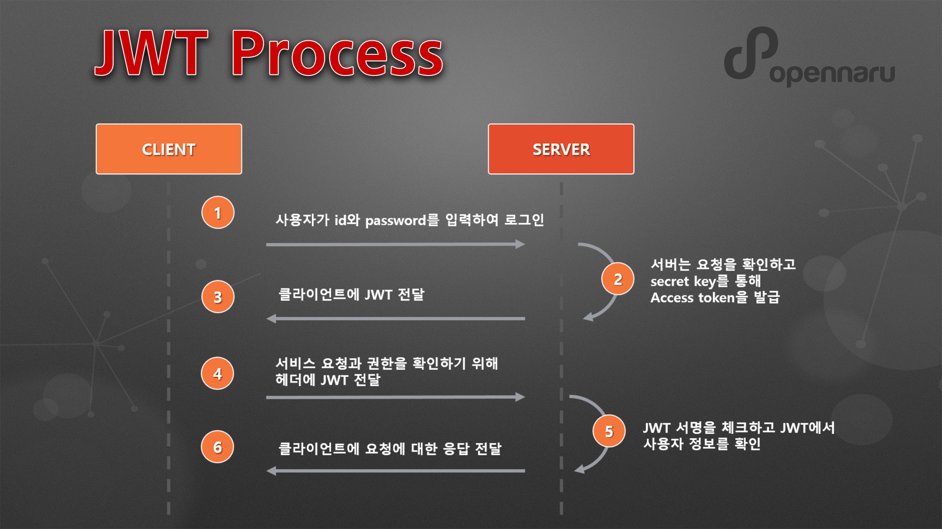 그 후, 사용자가 서버에 요청을 할 때 마다 JWT를 포함하여 전달합니다. 서버는 클라이언트에서 요청을 받을때 마다, 해당 토큰이 유효하고 인증됐는지 검증을 하고, 사용자가 요청한 작업에 권한이 있는지 확인하여 작업을 처리합니다.