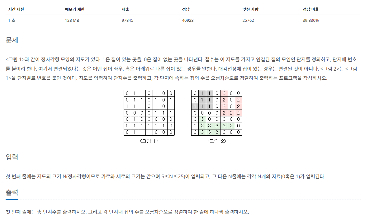 <그림 1>과 같이 정사각형 모양의 지도가 있다. 1은 집이 있는 곳을, 0은 집이 없는 곳을 나타낸다. 철수는 이 지도를 가지고 연결된 집의 모임인 단지를 정의하고, 단지에 번호를 붙이려 한다. 여