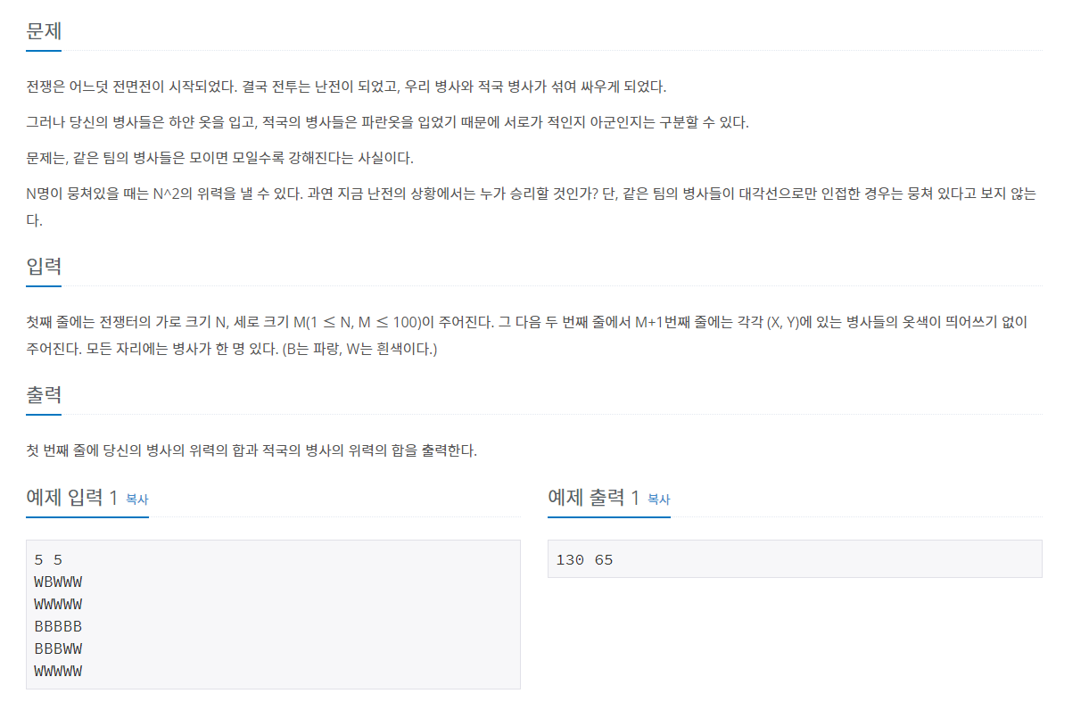 첫째 줄에는 전쟁터의 가로 크기 N, 세로 크기 M(1 ≤ N, M ≤ 100)이 주어진다. 그 다음 두 번째 줄에서 M+1번째 줄에는 각각 (X, Y)에 있는 병사들의 옷색이 띄어쓰기 없이 주어진다. 모든 자리에는