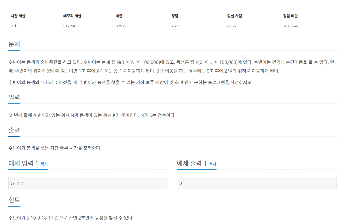 수빈이는 동생과 숨바꼭질을 하고 있다. 수빈이는 현재 점 N(0 ≤ N ≤ 100,000)에 있고, 동생은 점 K(0 ≤ K ≤ 100,000)에 있다. 수빈이는 걷거나 순간이동을 할 수 있다. 만약, 수빈이의 위치가 X일