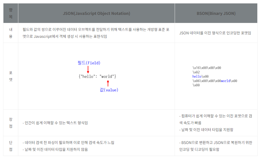 mongoDB는 데이터를 관리하기 위한 형식으로 데이터 입출력 시에는 JSON 형식을 사용하고 데이터 저장 시에는 BSON 형식을 사용합니다. 다음은 JSON과 BSON 형식에 대한 자세한 내용입니다.