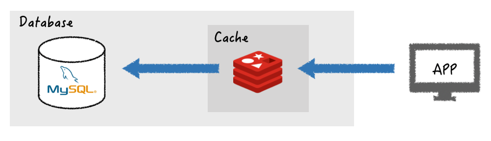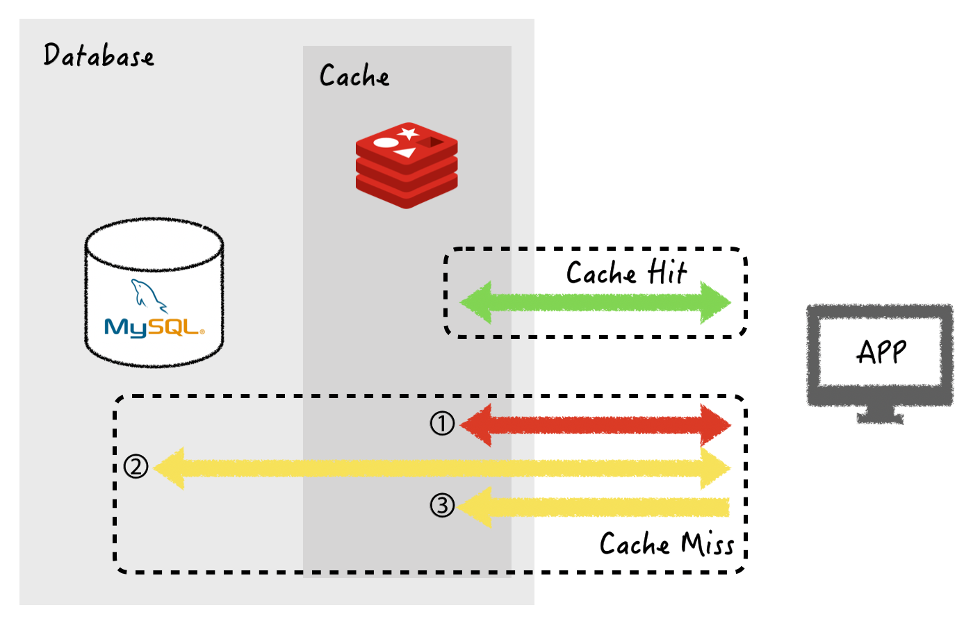 이름에서 알 수 있듯이 이 구조는 캐시를 옆에 두고 필요할 때만 데이터를 캐시에 로드하는 캐싱 전략입니다. 캐시는 데이터베이스와 어플리케이션 사이에 위치하여 단순 key-value 형태를 저장합니다. 어플리케이션에서 데이터를 가져올 때 레디스에 항상 먼저 요청하고, 데이터가 캐시에 있을 때에는 레디스에서 데이터를 반환합니다. 데이터가 캐시에 없을 경우 어플리케이션에서 데이터베이스에 데이터를 요청하고, 어플리케이션은 이 데이터를 다시 레디스에 저장합니다. 아래 그림은 이 프로세스를 나타내고 있습니다.