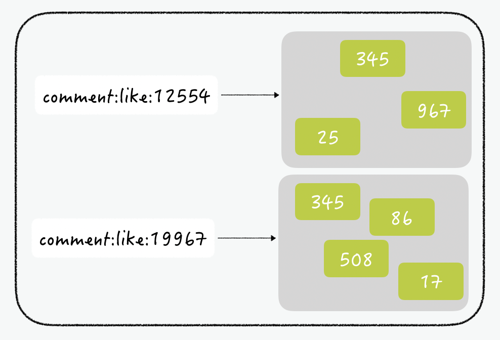 레디스의 set을 이용하면 이 기능을 간단하게 구현할 수 있으며, 빠른 시간 안에 처리할 수 있습니다. set은 순서가 없고, 중복을 허용하지 않는 집합입니다. 댓글의 번호를 사용해서 key를 생성하고, 해당 댓글에 좋아요를 누른 사용자의 ID를 아이템으로 추가하면 동일한 ID값을 저장할 수 없으므로 한 명의 사용자는 하나의 댓글에 한번만 좋아요를 누를 수 있게 됩니다.