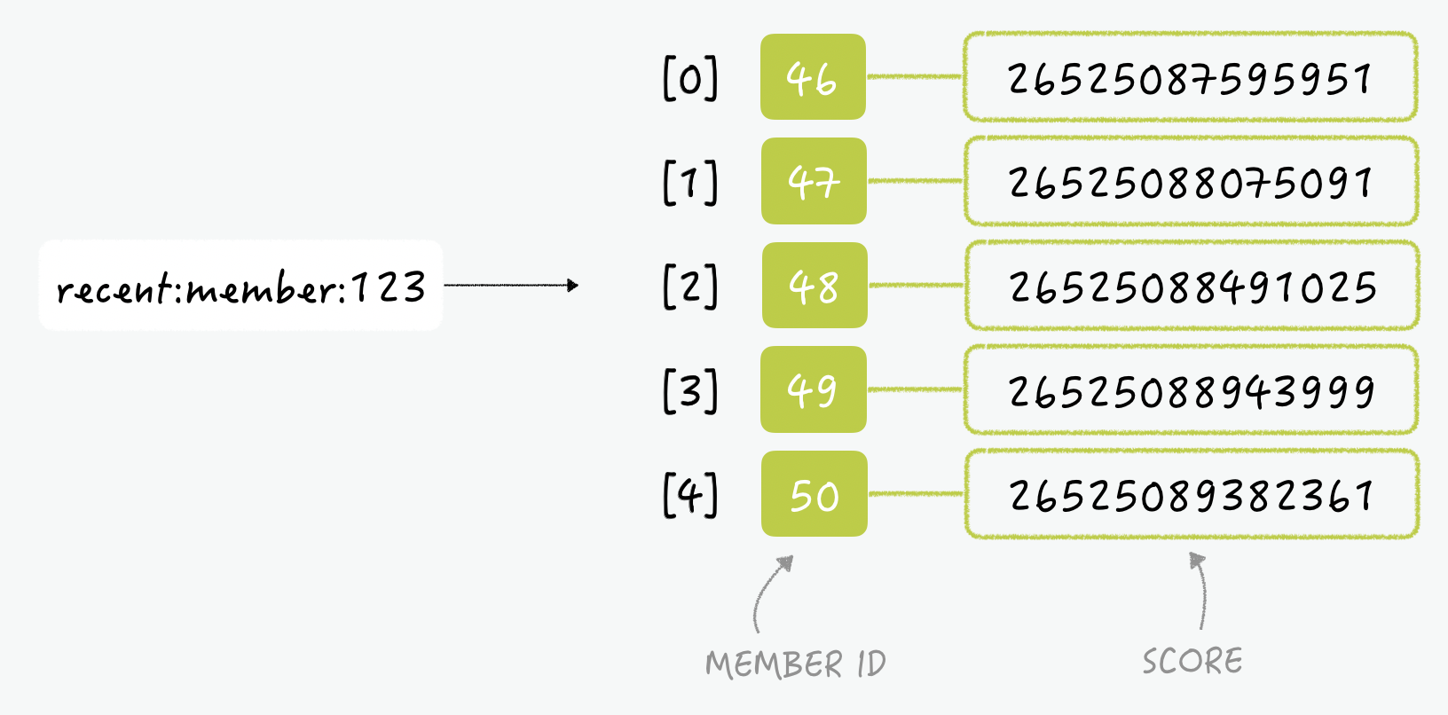 따라서 애초에 중복을 허용하지 않고, 정렬되어 저장되는 레디스의 sorted set을 사용하면 간단하게 구현할 수 있습니다. sorted set은 가중치를 기준으로 오름차순으로 정렬되기 때문에, 가중치로 시간을 사용한다면 이 값이 가장 큰, 나중에 입력된 아이템이 맨 마지막 인덱스에 저장됩니다.