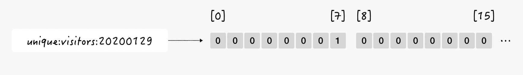 사용자 ID는 0부터 순차적으로 증가된다고 가정하고, string의 각 bit를 하나의 사용자로 생각할 수 있습니다. 사용자가 서비스에 방문할 때 사용자 ID에 해당하는 bit를 1로 설정합니다. 1개의 bit가 1명을 의미하므로, 천만명의 유저는 천만개의 bit로 표현할 수 있고, 이는 곧 1.2MB정도의 크기입니다. 레디스 string의 최대 길이는 512MB이므로 천만명의 사용자를 나타내는건 충분합니다.