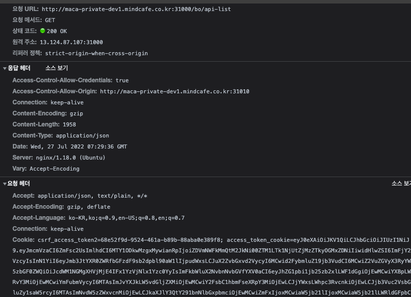 Credentials는 True로 제대로 됐지만, access-control-allow-origin에 값이 두개가 들어가 있다.