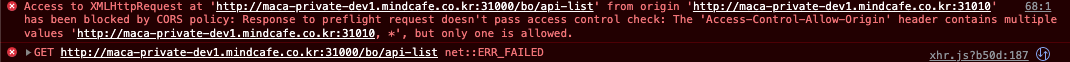에러메시지를 읽어보니, response의 Access-Control-Allow-Origin 헤더가 값이 한개여야 되는데, 두개가 들어왔다는 것.