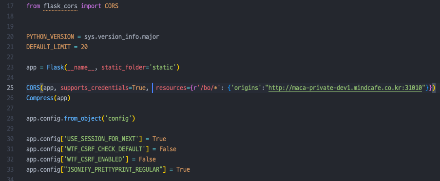 그리고 어떻게 설정하는지 찾아보니 Flask 프로젝트에서 app=Flask(__name__)을 해주는 곳 뒤에 코드를 추가하라고 한다.