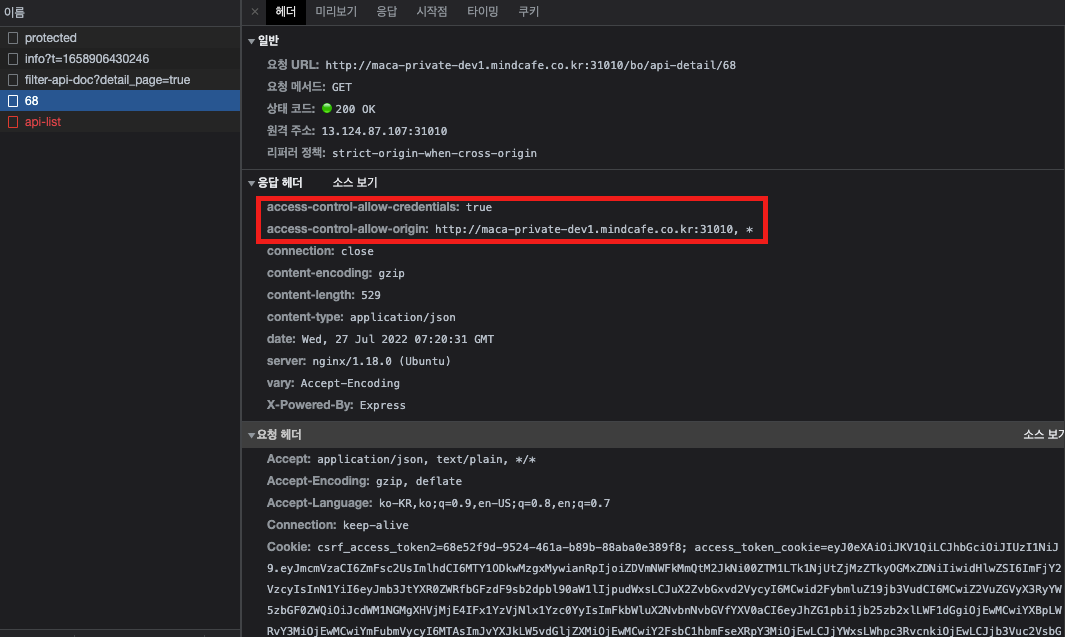 그래서 access-control-allow-origin : *을 지워보려고 한다.