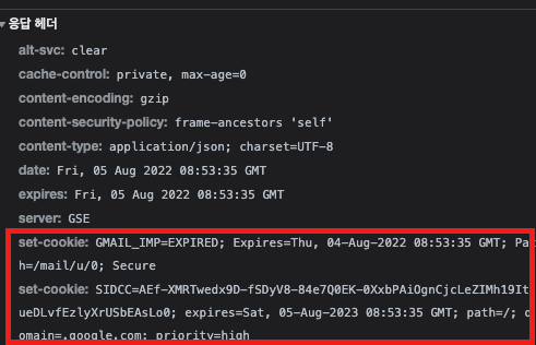 - Response Header에서 Set-Cookie의 속성으로 클라이언트에서 쿠키를 만들게 함