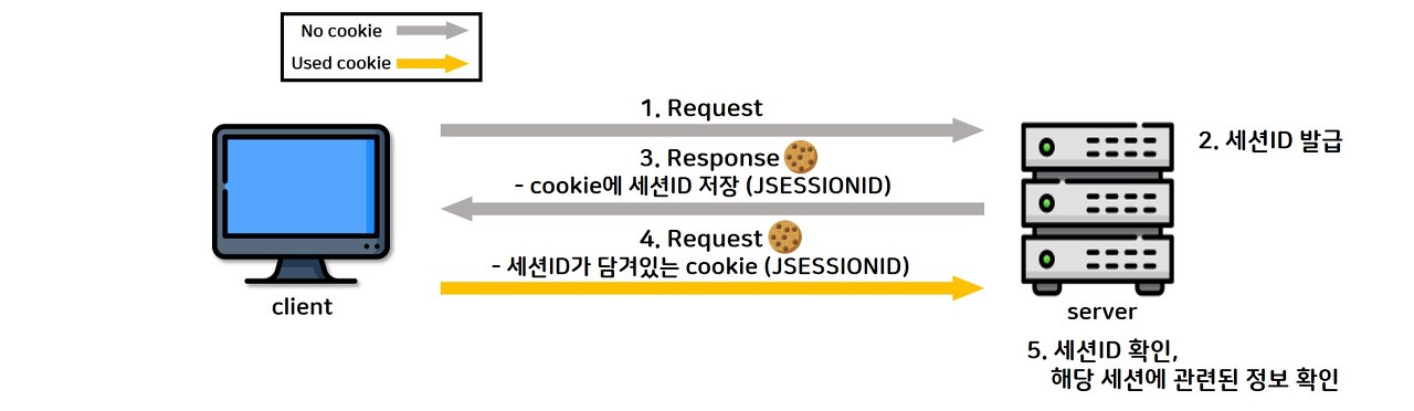 - 클라리언트는 서버에 요청할 때, 이 쿠키의 세션 ID를 같이 서버에 전달해서 요청