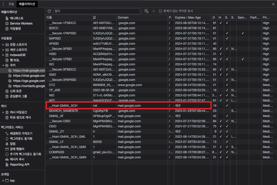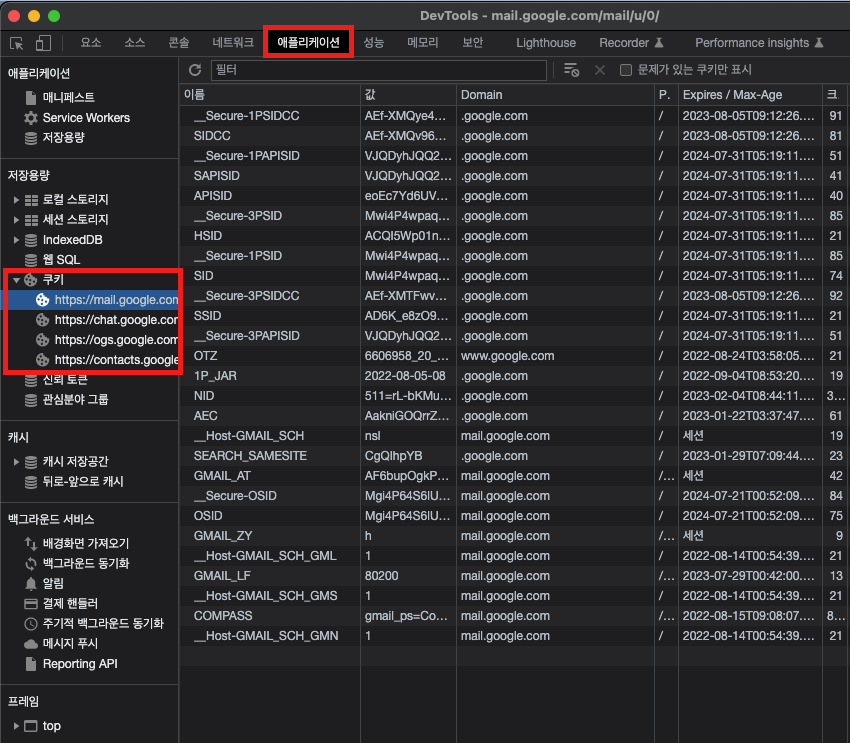 브라우저에서 F12를 눌러 개발자 도구에 들어가고, "애플리케이션(Application)"을 누르고, 좌측의 쿠키를 누르면 볼 수 있다.
